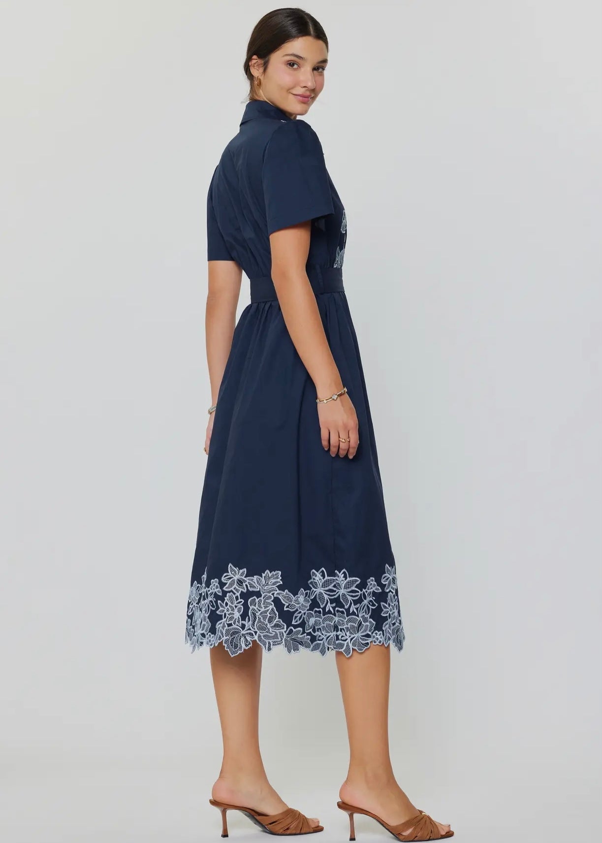 Embroidered Button Down Belted Midi Dress