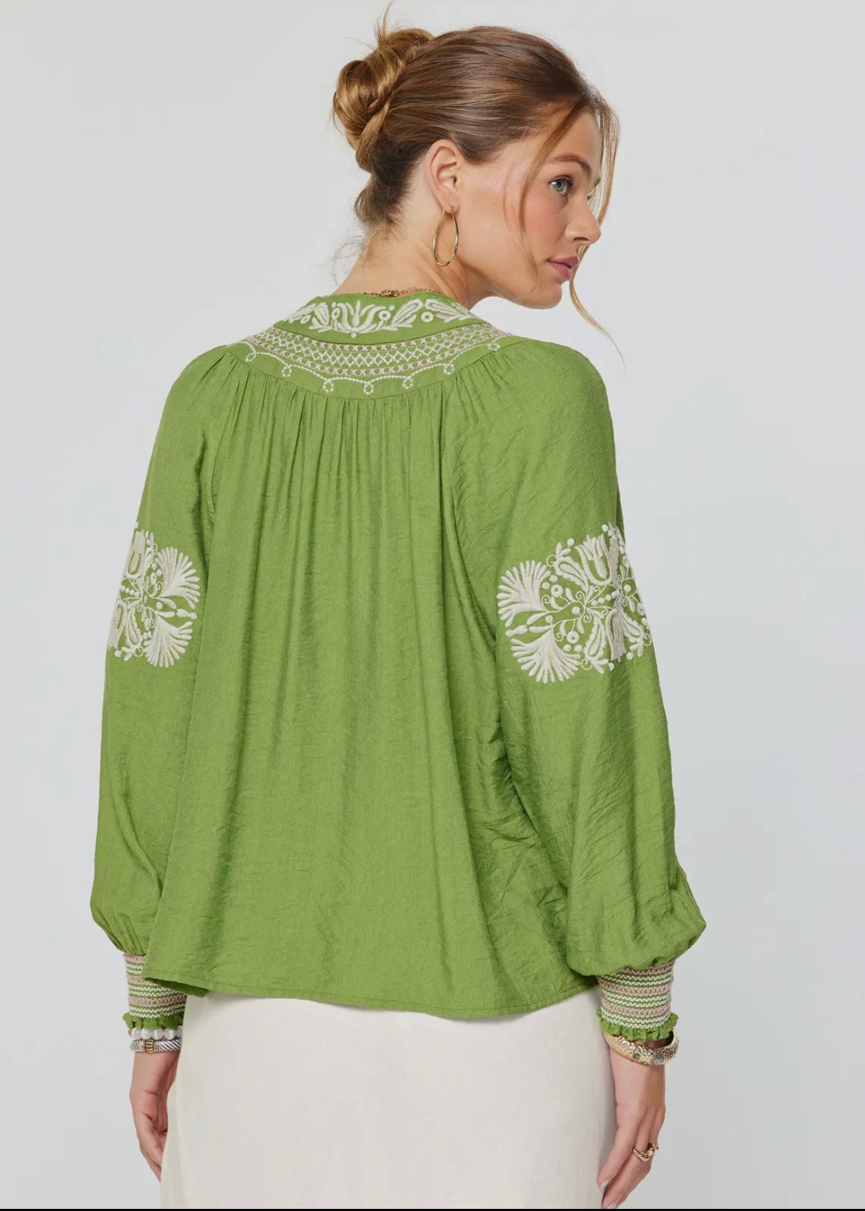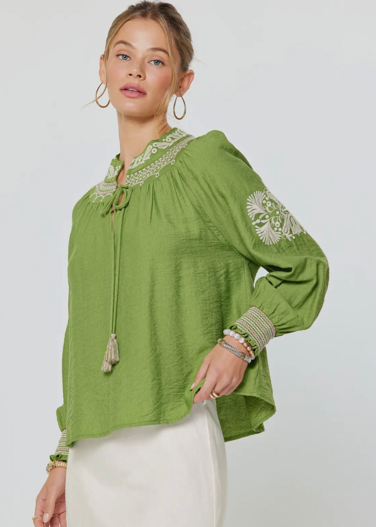 Embroidered Detail Split Neck Tassel Tie Blouse