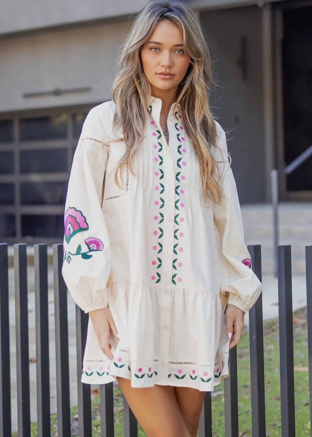 Embroidered Pintuck Shirt Mini Dress